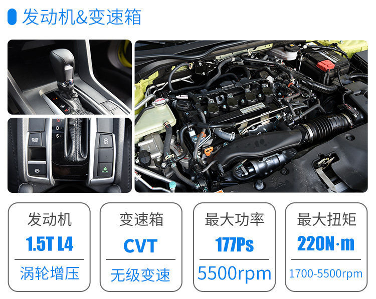 2019款220TURBO CVT燃擎版 思域搭载本田地球梦系列里的1.5T涡轮增压引擎,匹配CVT变速箱,最大马力达到177Ps,峰值扭矩220N·m。实际体验过程,这套总成动力输出有劲,而且得益于CVT变速箱先天优势,换挡平顺迅速,不仅中后段提速迅捷,而且燃油经济性表现非常好。