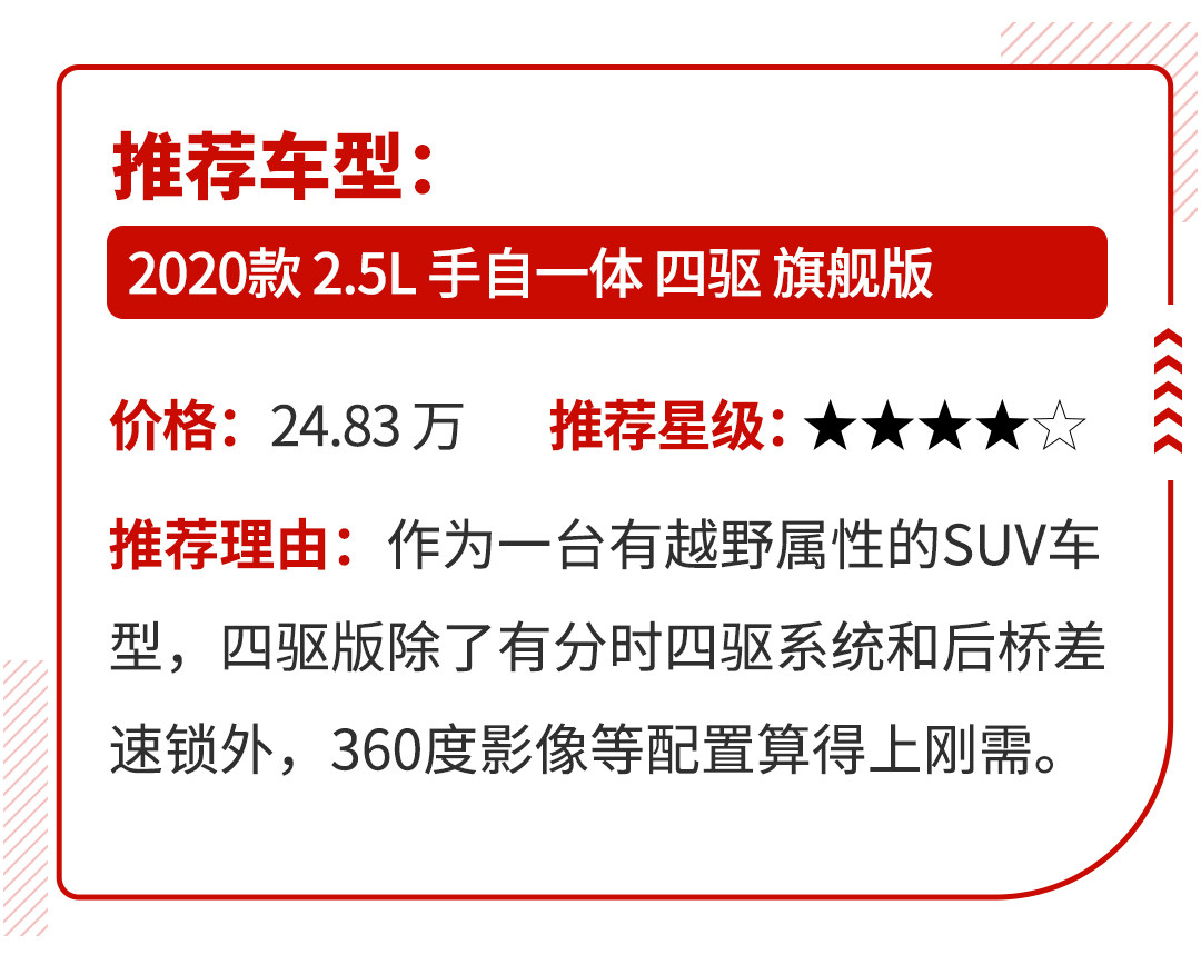 配合前置后驱的驱动形式,顶配车型还有分时四驱系统加持,即使没有差速锁,其野外业务能力也要比一般城市SUV强不少。