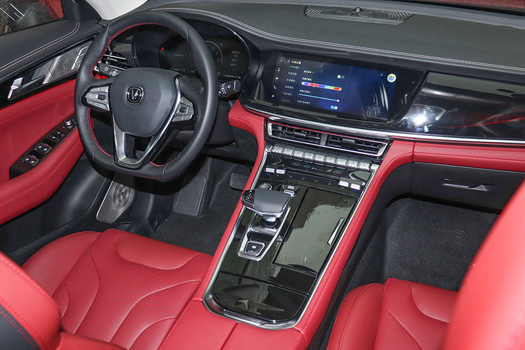 CS85 COUPE的内饰采用了红黑相间的配色,并且使用了大面积的钢琴漆面,中控台和车门都有红色皮革覆盖,连方向盘也都是红线缝制,很明确它要走的就是豪华运动路线,而且做得确实不错。配置方面,主流的12.3英寸液晶屏,集成网络功能,基本省去了再使用手机蓝牙。舒适型配置如座椅通风/加热,自动倒车,安全驾驶辅助都非常丰富。