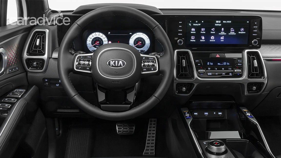 内饰方面则没有得到实拍图,根据官图来看,新车最新的中控台风格同样与全新索兰托高度相似,未来或配备全液晶仪表盘以及悬浮式中控屏,并搭配三幅式方向盘和旋钮式电子档把,其次空调出风口造型颇有新意,而细节部分还融入了大量的镀铬条、菱形格装饰板以及氛围灯等,质感相当不错。