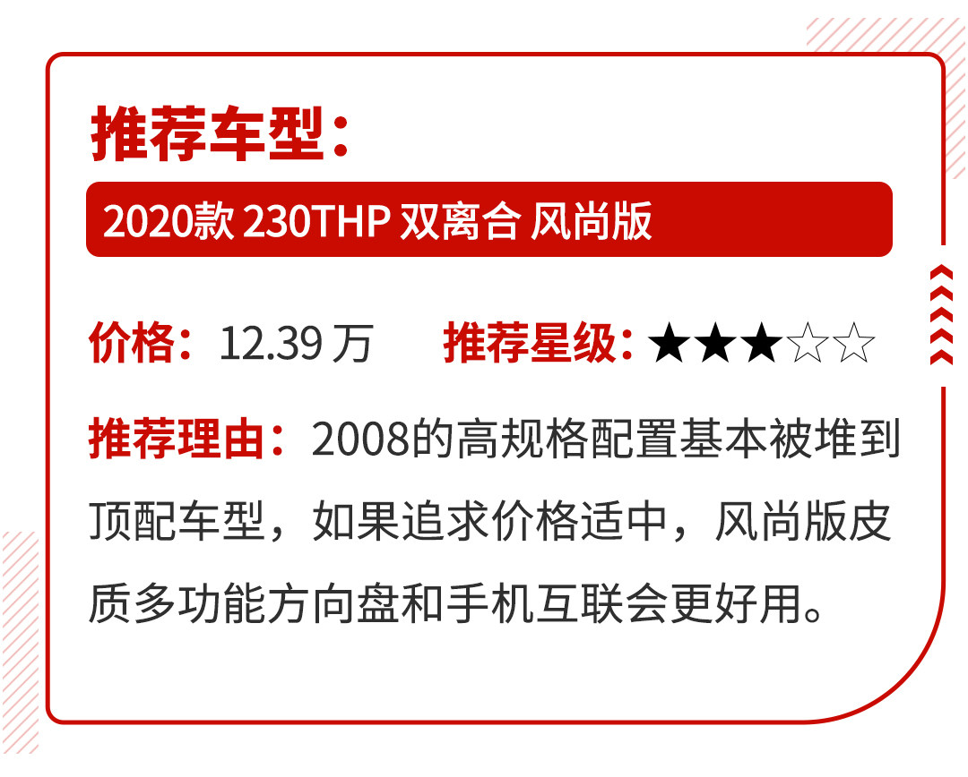 全新标致2008基于最新的CMP平台打造而来,搭载了一台1.2T涡轮增压发动机,最大功率136马力,峰值扭矩230牛·米,匹配了一台6速双离合变速箱。