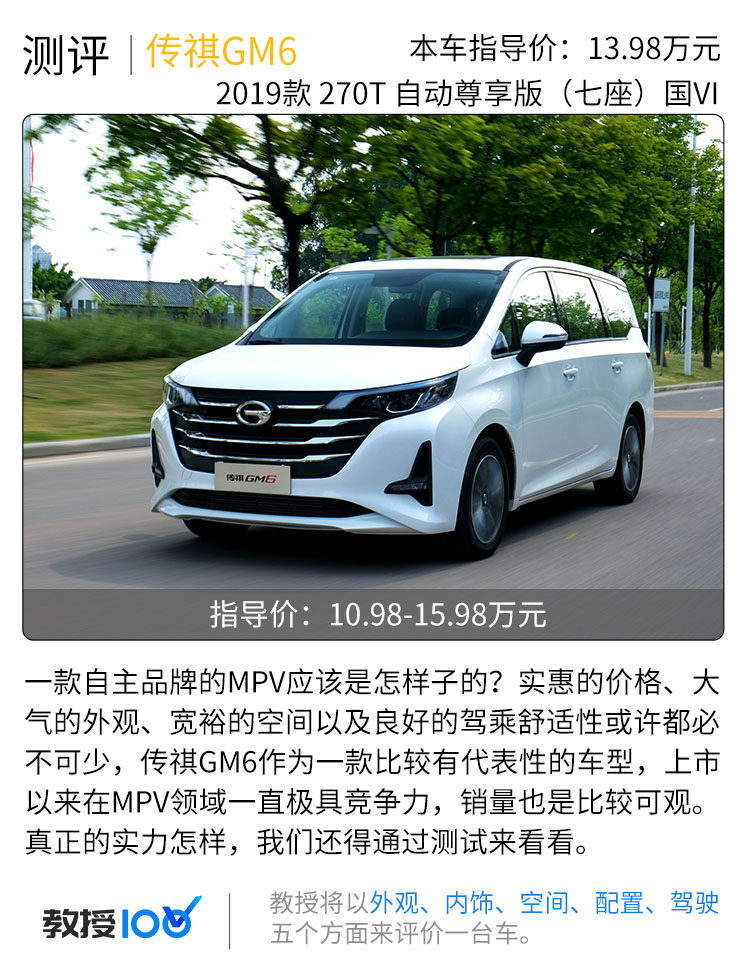 早在传祺GM6未上市之前,教授就曾经对这款车型进行过试驾,定位稍低于GM8的GM6,在外观、内饰、空间都给教授留下了较为深刻的印象。在与传祺厂家沟通的时候,他们也曾经说过,不指望GM6能够大火,一个月能卖三五千台就非常满足了。事实上,GM6的表现和传祺期望的相差无几。如今自主品牌的MPV接踵而至,GM6在众多车型中实力几何,一起来看看。