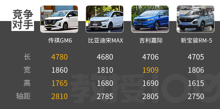 在尺寸上,相对于竞品车型来说,传祺GM6的优势十分明显,长度、高度和轴距都遥遥领先,因此更加有利于车内空间的营造。