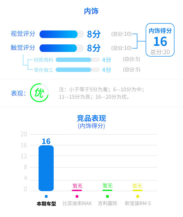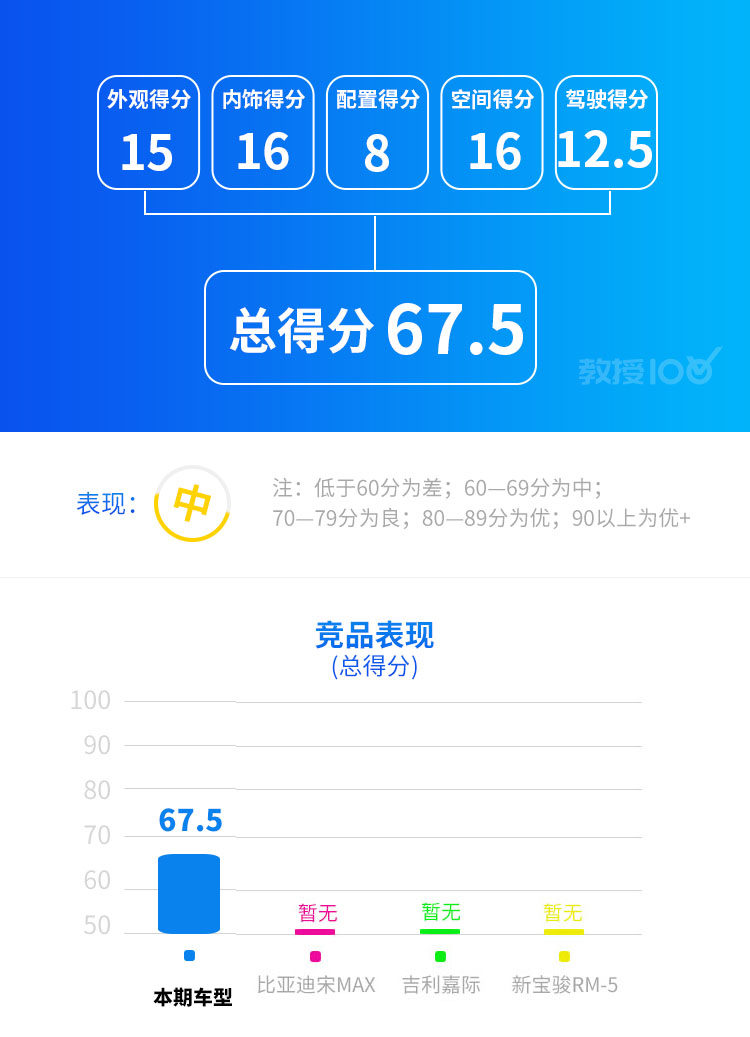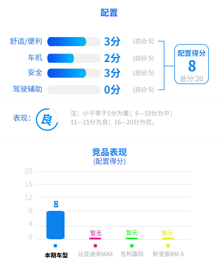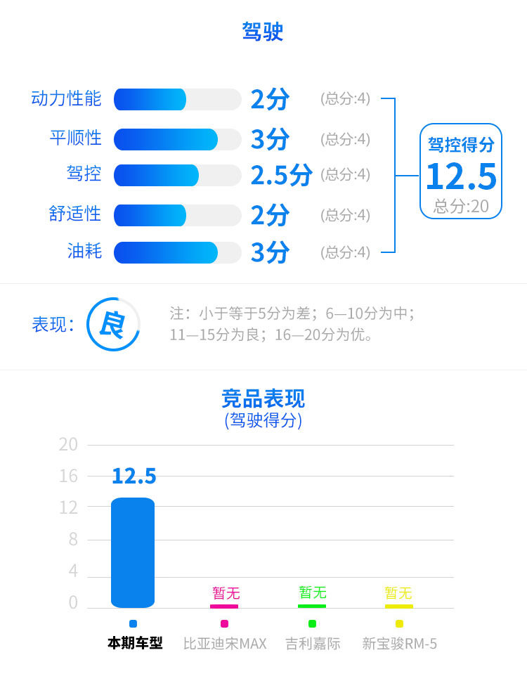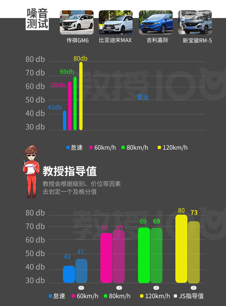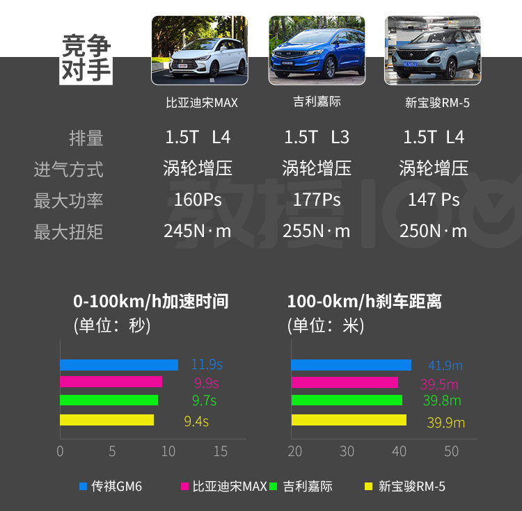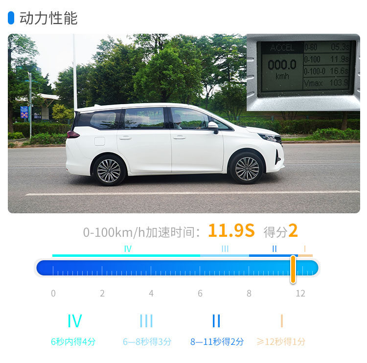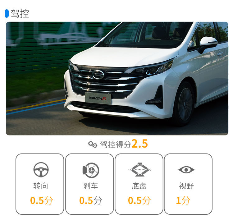 小结:在配置方面,传祺GM6的表现差强人意,毕竟不是顶配车型,一些更高级的配置缺失也是在情理之中。在驾驶辅助这一项,本次测试的车型并没有主动刹车、车道偏离、自动泊车这些功能,因此得分为零。所以总体来看,传祺GM6这个中配车型,在整体配置的表现上并没有得到一个较高的分数。