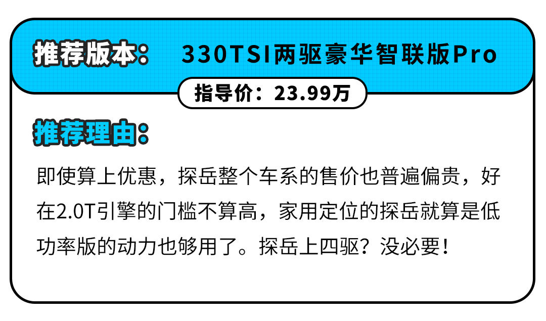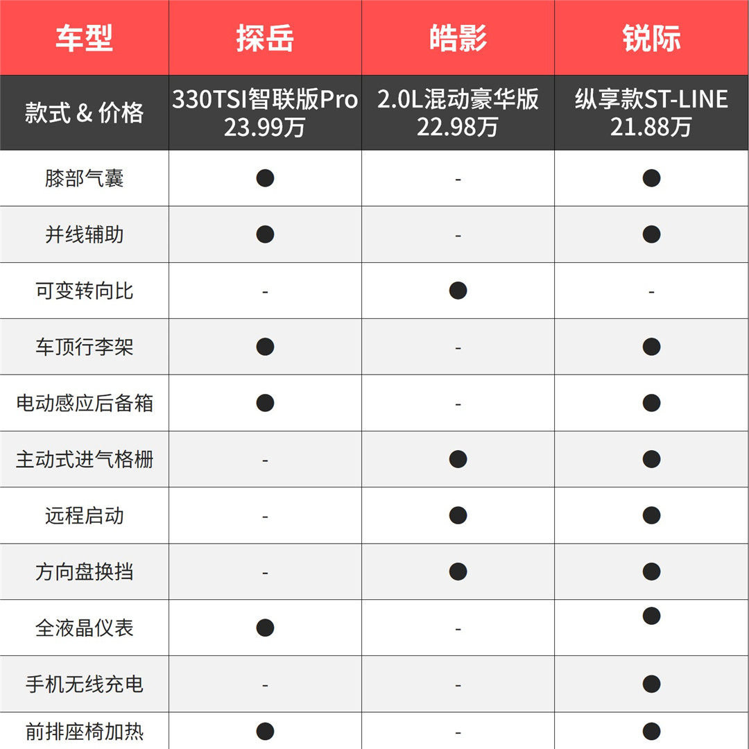 篇幅所限,若以买买君推荐的款式为例,列举它们最具优势的配置进行对比,那么锐际的配置无疑是最齐全的。而且大家别忘了,顶配锐际仅售21.88万,探岳和皓影即使加钱买各自的顶配,配置也不一定能超越锐际。