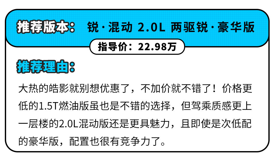 皓影分为了1.5T+6速手动/CVT变速箱的燃油版,以及2.0L混动版。买买君强烈建议大家入手2.0L混动版, 低得变态的油耗固然是原因,但买买君更看重的还是混动版优秀的静谧性所带来的越级驾乘体验,况且全油门发力时,混动版的加速感受甚至比燃油版还来的迅猛。
