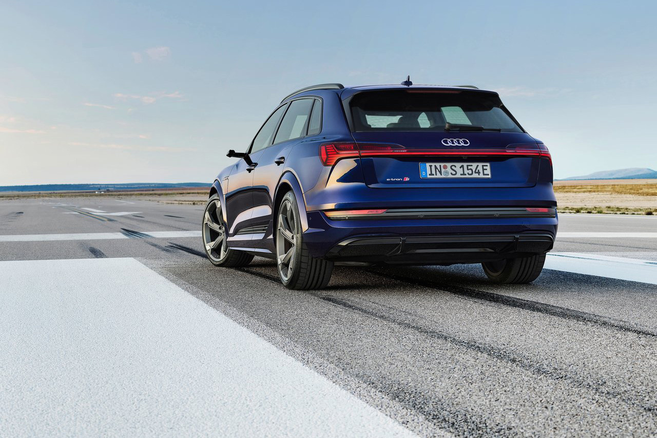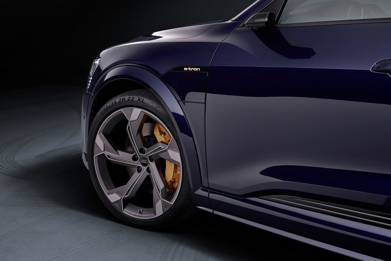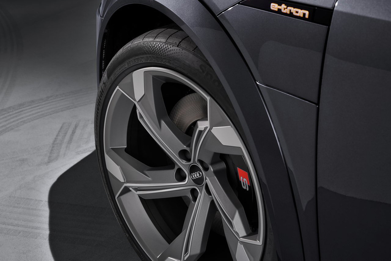 轮胎的标准规格为20英寸,胎宽为285mm,而21英寸/22英寸则作为选装。新车采用6个活塞的固定卡钳,喷涂为传统的黑色,并且用S徽标进行身份标榜。当然,如果为了突出的视觉效果,也可以喷涂为橙色,并用e-tron徽标装饰。其中,刹车片仅仅150毫秒就与制动盘完全接触,为车辆起到优异的制动效果。