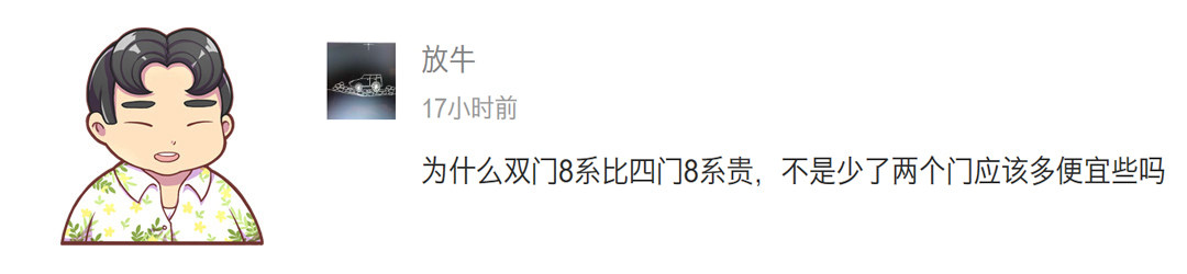 物以稀为贵,虽然宝马8系的四门轿跑也不便宜,但从实际用车需求量上来说,买四门轿跑的肯定远多于双门轿跑。换句话说,在需求量更小的情况下,双门轿跑平摊到平台上的成本自然要高于需求量更大的四门轿车。