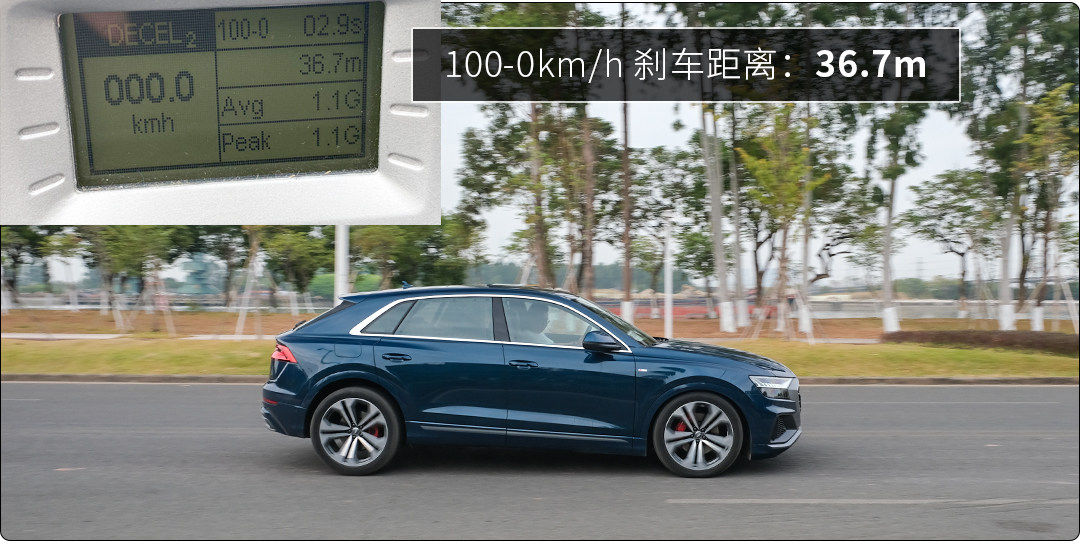 奥迪Q8在完全踩下制定踏板瞬间,踏板没有反馈太多的冗余行程,制动时车身的俯仰姿态比较明显,制动力度和轮胎抓地力都颇为出色。