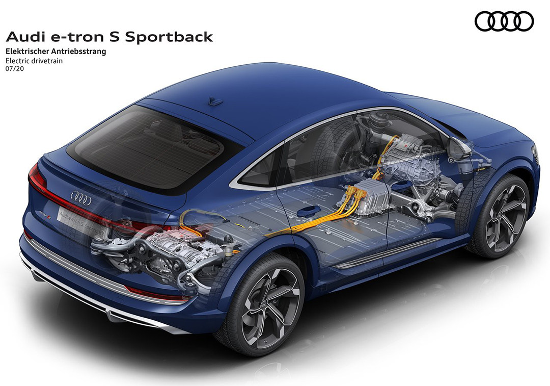 作为主打性能的纯电车型,e-tron S的三电机分布也更为合理,前面一台电机,后面两台电机,配重十分合理,也能最大程度上发挥电机的组合动力。
