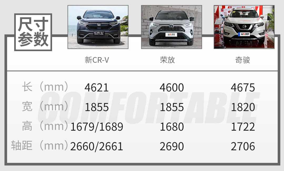 正如今天的主角新CR-V 4621*1855*1679mm(两驱车型)1689mm(四驱车型)的三围和2661mm(两驱车型)、2660mm(四驱车型)的轴距对比同级两位主要竞品并未展现出压倒性的优势,但真正的乘坐和储物空间却让人眼前一亮。