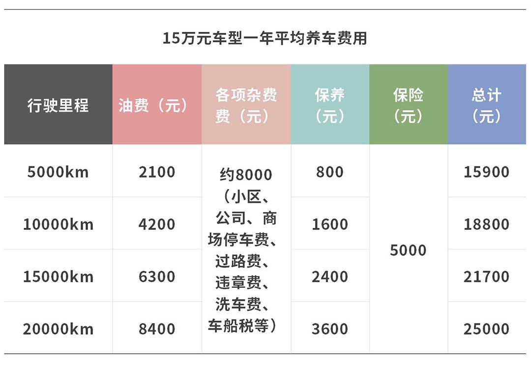 在买车之后,养车的费用也是一件必须要考虑的事情,以一台15万元左右的车型,百公里油耗7L,92号汽油油价6元为例,一年的养车费用通过简单的计算,就可以得到上图的一个结果。当然每个车主的个人情况有所不同, 仅供参考,不过一年一两万的养车费用肯定是少不了的!