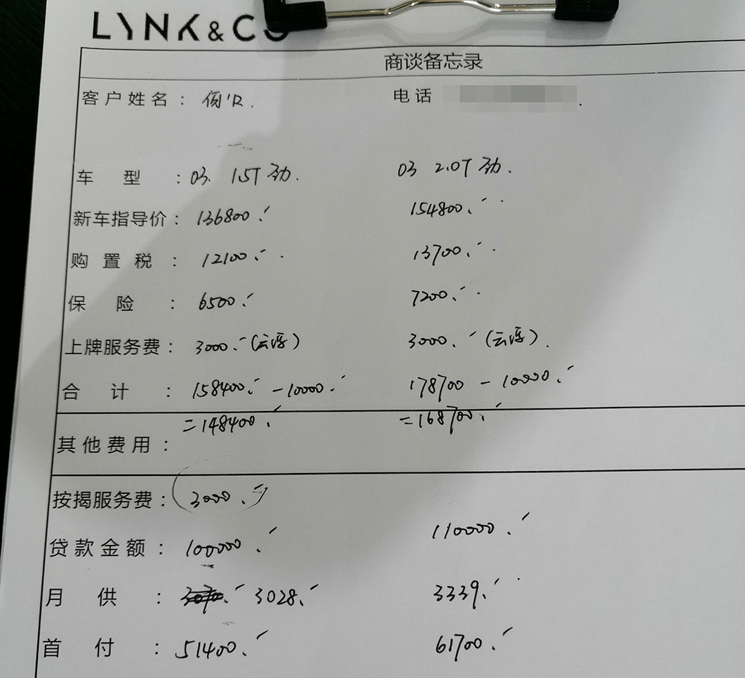 教授刚好此前到店探过领克03的价格,那就一这个车型为例。2.0T的劲版本指导价为154800元,优惠1万元,购置税要13700元,保险7200元,上牌服务费3000元,贷款11万的话首付要61700元,月供3339元。如果把这个车型换成其他如雷凌、思域等价格相近的主流家用车,其实整体的费用也大同小异。