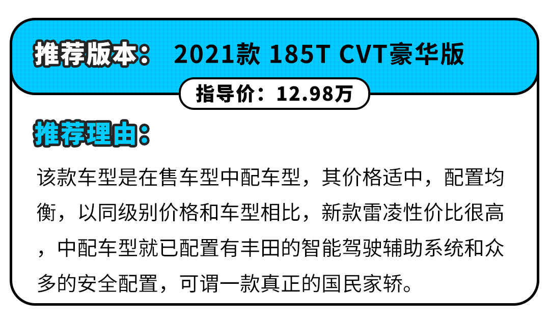 另外值得一提就是,丰田的智能驾驶辅助套件也下放到了中低配车型上,从性价比的角度分析,其185T CVT豪华版最值得买,这一款中低配车型,售价为12.98万元,再加上市场终端优惠1.2万元左右,这个售价面对一些市面上竞争力十分强劲的对手,完全有优势,就凭它是丰田品牌。