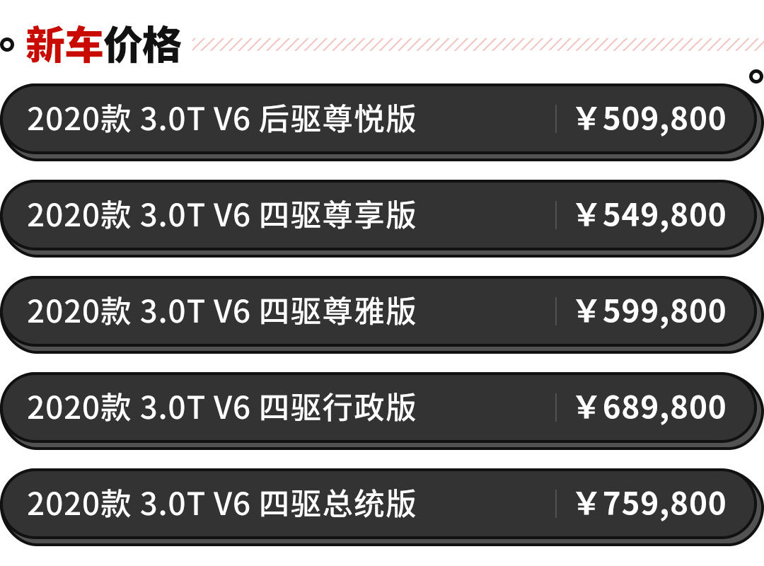 售价为54.98万的四驱尊享版,教授觉得是最值得入手的一个版本。首先硬核方面,3.0T+10AT动力总成,还有适时四驱系统的配备,硬实力不可小觑。别说规格一样的安全气囊,就算是包含主动刹车/主动安全系统、道路交通识别标志以及车道保持辅助系统等在内的主动安全系统,这些都是一应俱全的。