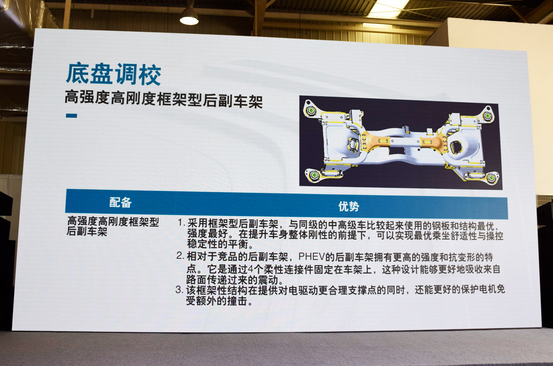 与普通多连杆独立后悬架车型不同的是,新车将驱动电机布置在框架式横梁中间,以更好的承载及保护电驱动机构,并在精准调校的基础上保证了系统功能的可靠性。