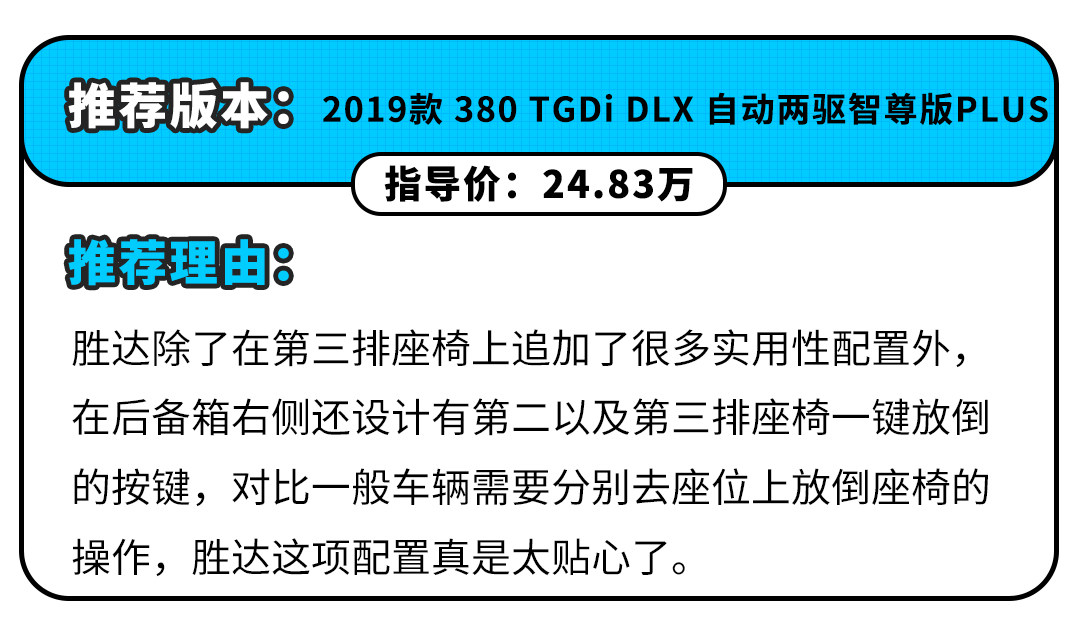 不过胜达全系标配的是2+2+2的6座布局,如果想升级为7座,可以选择2000元的7座选装包。虽然6座车的载人能力不如7座版,但也同样存在优势,例如与5座车同样有6年免检的政策支持,同时中间留有过道的设计也方便第三排乘客上下车,第二排独立座椅更高的乘坐舒适性等。至于是否要添加7座选装包,就看不同消费者的用车需求了。