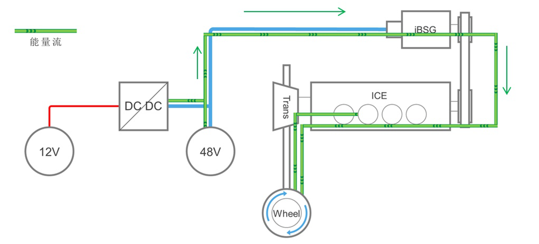 48V轻混系统的原理其实都是一样的,BSG电机给整个动力系统提供充足的扭矩,补充发动机在低转速时动力的不足。滑行或者制动时可以通过动力回收,给电池充电,从形成一个循环的系统,能够有效降低油耗。