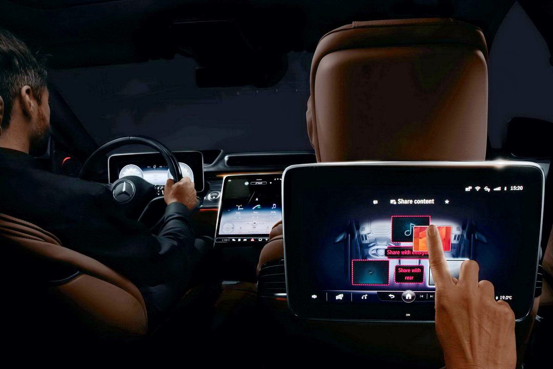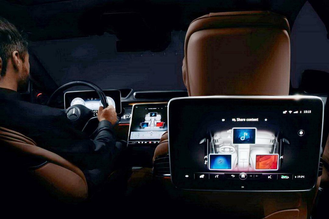 新的MBUX系统给予后排乘客三个触屏,可以控制车内的各种不同的配置,也可以通过语音助手来控制车内的配置。