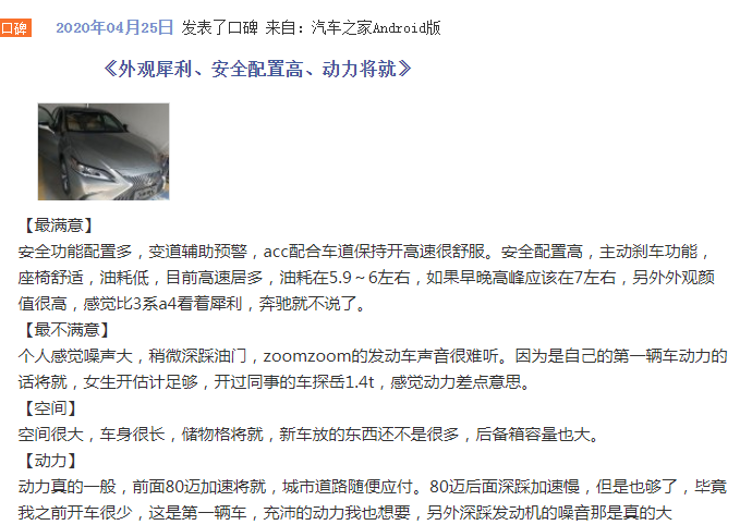 虽然ES有“魔力”能够扭转乾坤,化缺点为优点。但只要浏览各大汽车论坛会发现吐糟ES 2.0L发动机动力不足的评论依然不在少数,毕竟超过10秒的百公里加速时间的确很难令大部分人满意。如果你是一位ES的潜在买家,却又是一个充满朝气、活力的人,那么入门的2.0L车型就要谨慎选择了。