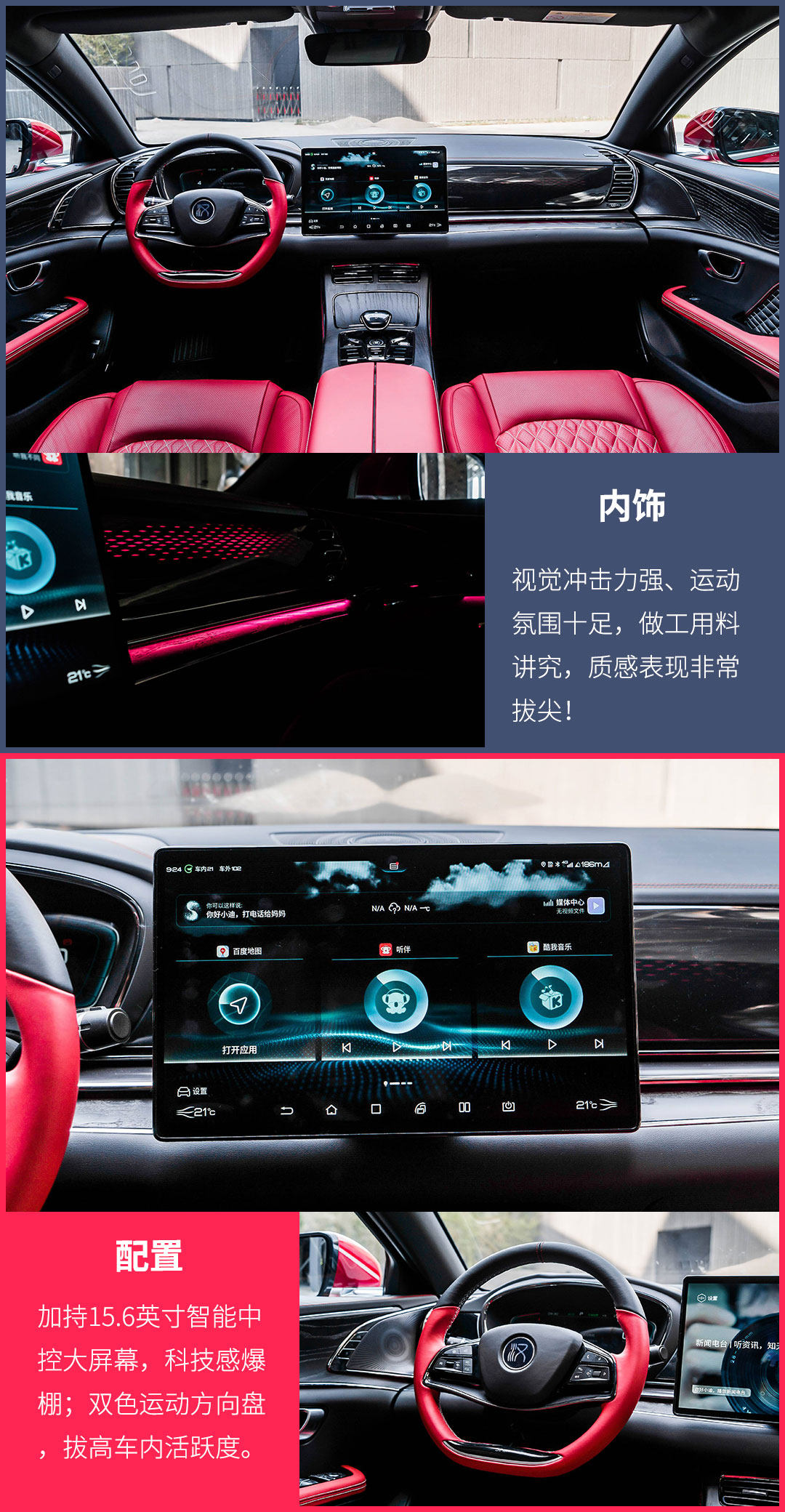 比亚迪汉内饰在原有设计语言的基础之上进行了革新,引入了一些新鲜元素,环形座舱对称设计营造出了更宽敞的视觉效果。红黑相间的方向盘以及15.6英寸的液晶触控屏幕异常吸睛。