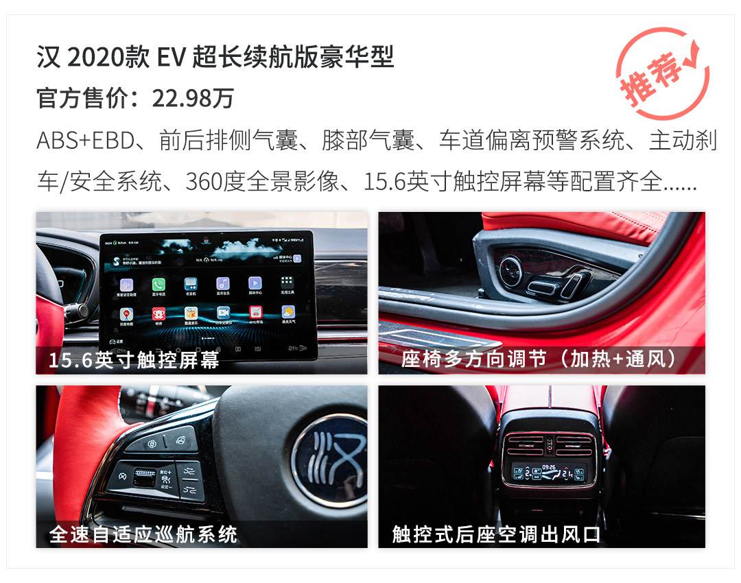 另一厢,比亚迪汉的配置表现倒是远远超出了我们的想象,除了一些常规配置,中高配车型的舒适配置也是诚意满满,加持了座椅靠背调节、老板按键、座椅按摩、加热、通风功能等......