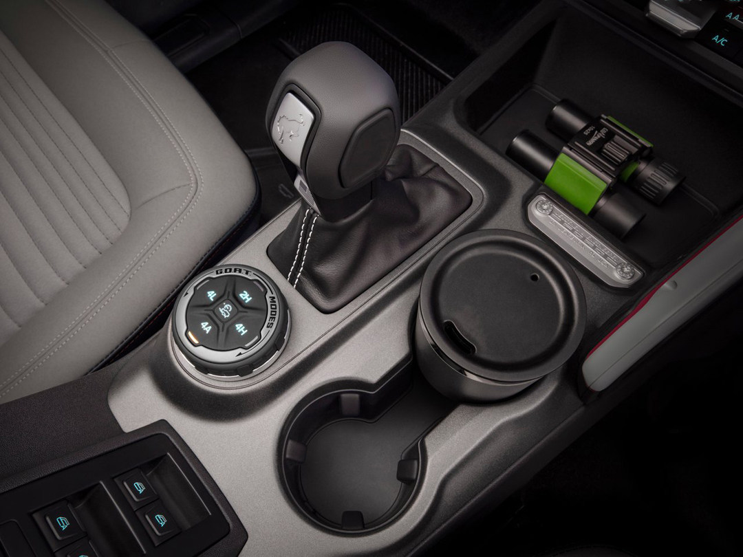 照片显示Bronco的内装以简单为主,大量功能都使用手动控制,不会像某些车型一样将功能隐藏在中央显示屏内部,需要用的时候还要翻开多重菜单,简单粗暴,这才是越野车应该有的样子。相比起那些手动切换四驱模式的车型来说,Bronco显得斯文得多,电控的四驱系统还带有陡坡缓降功能,让你毫不费力地去野。