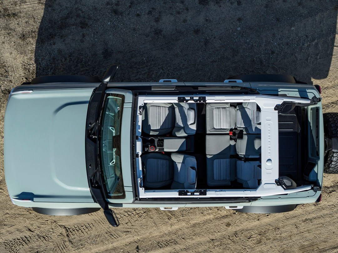 Bronco车身有几个结构件可以快速拆卸,据称车主能够将车身拆下,并将其放置在车辆的后部;车顶也可以进行拆卸,在越野的同时还能享受像风一样自由,虽然很有可能成为吃土少年,但是没关系,帅就完了,其他的不要紧(要是我开这车,肯定不会把所有东西拆开,毕竟洗车有点痛苦)。