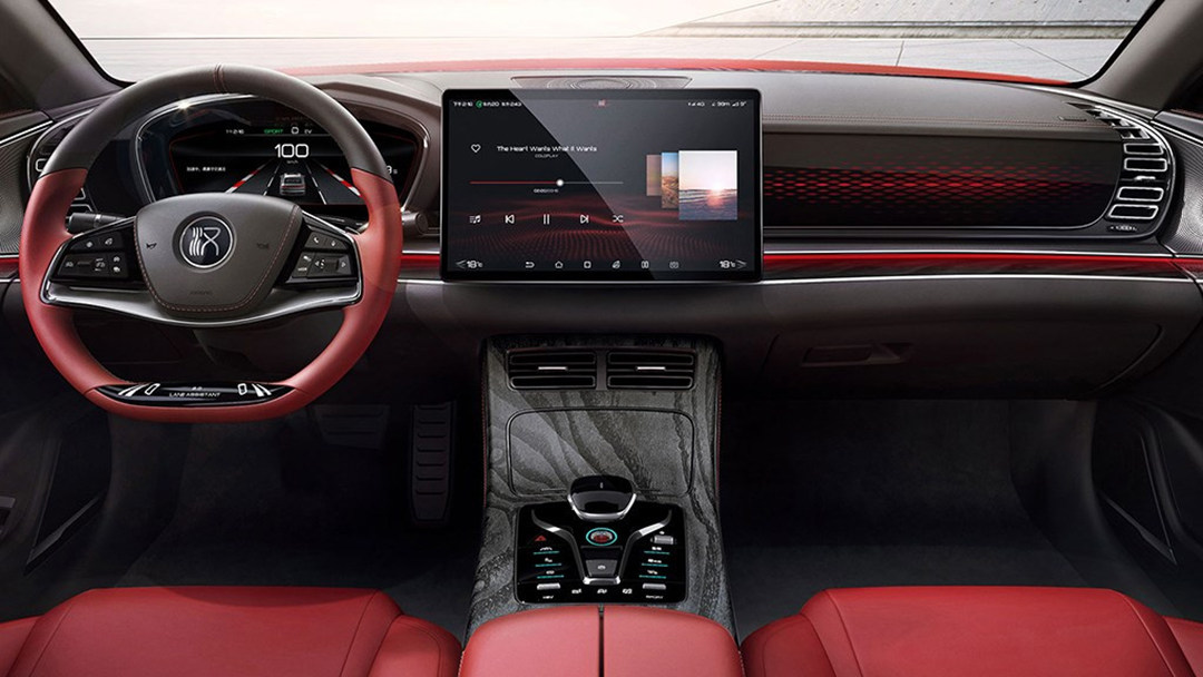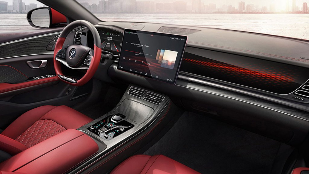 内饰方面,可选活泼的红黑撞色设计,整体设计观感非常典雅,基本没有按键,而是依靠中央那个可以旋转的大尺寸屏幕进行操作。新车还带有非常精致的“龙麟“氛围灯、电子挡把以及全液晶仪表盘,给你一种豪车的感受。