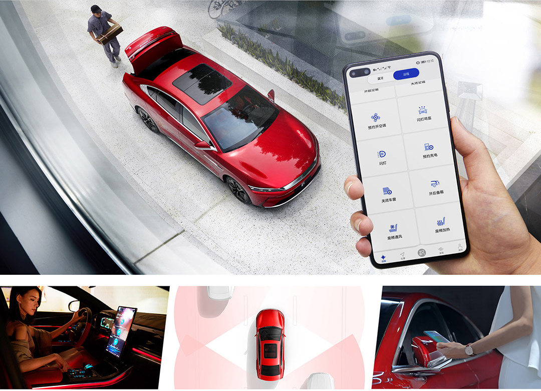 除此之外,汉EV搭载了华为HiCar基于鸿蒙开发的手机汽车互联系统,可动态监测车况及定位,据悉之后会推出5G版本;另外华为还专为汉开发了手机NFC钥匙,通过触碰后视镜就可以解锁车辆。