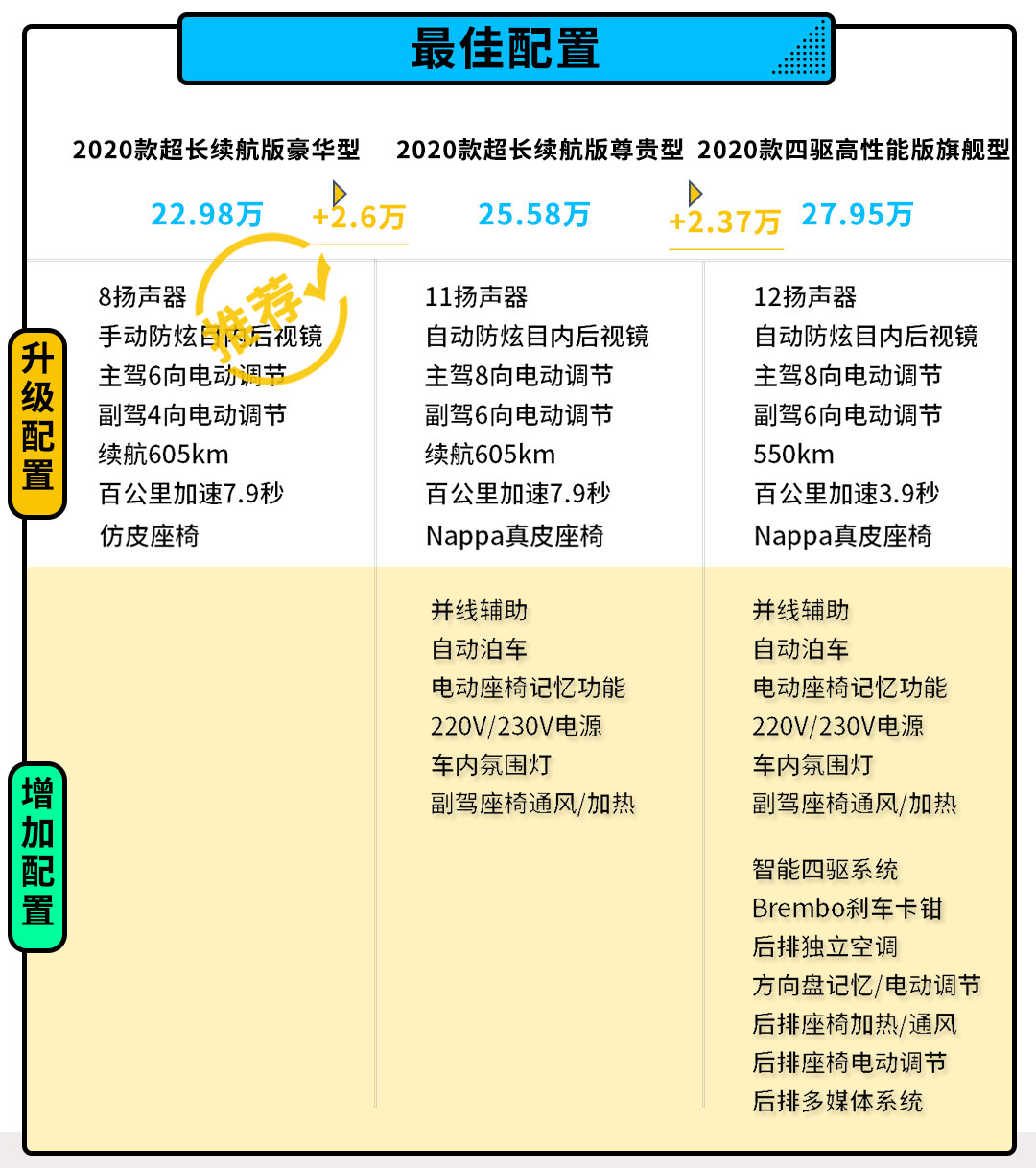 比亚迪汉EV版共提供三款车型,两款续航605km的后驱长续航版,一款续航550km的四驱高性能版,其中长续航尊贵版比长续航豪华版贵了2.6万元,主要升级了一些配置,包括8向主驾电动座椅调节、11个扬声器、Nappa真皮座椅、自动防炫目后视镜等,另外还增加了并线辅助、自动泊车、电动座椅记忆、车内氛围灯等。基于豪华型的配置已经不错,所以买买君认为没有必要多花2.6万元购买长续航尊贵版。