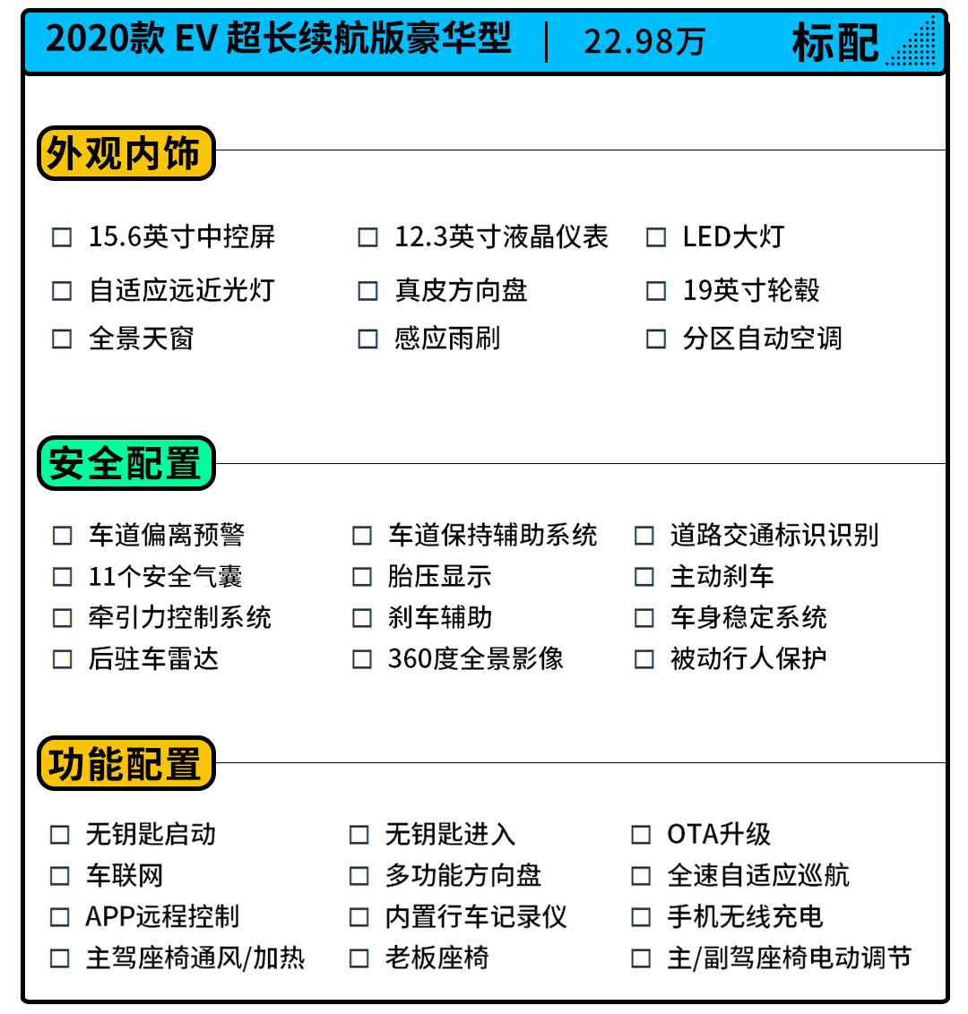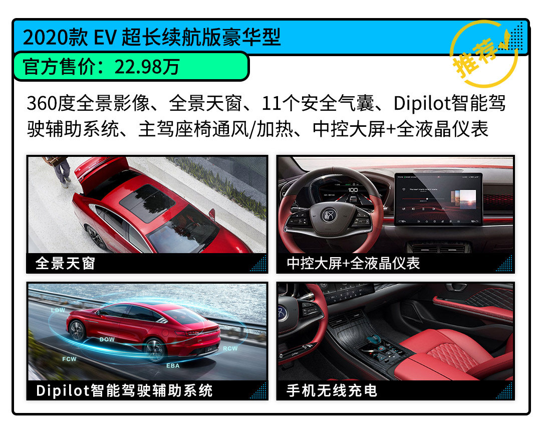 作为电动版(EV版)入门级车,售价22.98万的2020款EV超长续航版豪华型(以下简称豪华型),在配置上并不偷懒。首先安全配置一点不含糊,11个安全气囊、360度全景影像、车身稳定系统、胎压显示等,目前主流的安全配置基本都给安排上了;另外还搭载了Dipilot智能驾驶辅助系统,包括自动紧急制动辅助系统、前向碰撞预警系统、自适应巡航等L2级自动驾驶的功能。一般而说,自动驾驶是电动车的主打功能,但出于定价的策略,该功能通常不会下放到低配车型中,而汉则比较诚意的全系标配。