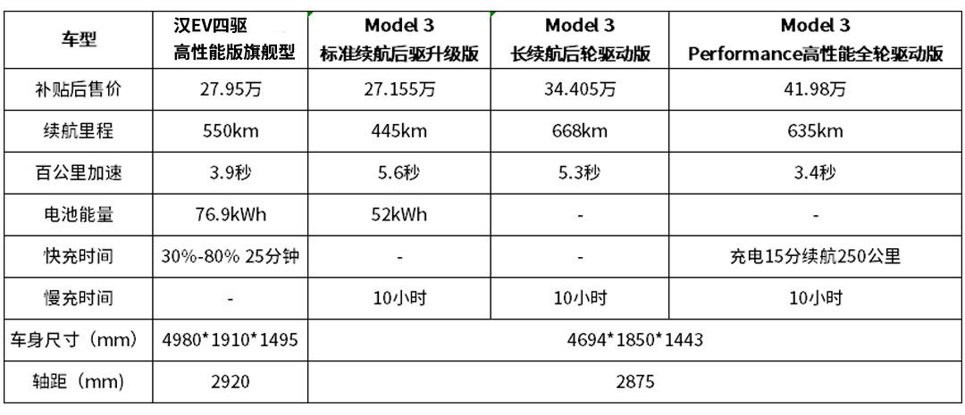 我们以汉EV为例,30万元不到可以买到顶配车型-四驱高性能版旗舰型,NEDC续航里程为550km,3.9秒破百。而同样的价格,只能买到Model 3标准续航后驱升级版,445km综合续航里程,5.6秒百公里加速成绩。