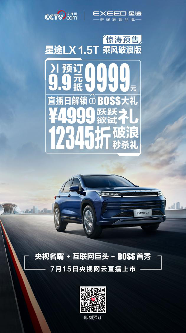 目前星途LX乘风破浪版已开启预售,即日起星途LX 1.5T乘风破浪版正式接受用户预订,现在预订可享受“9.9元抵9999元”惊涛大礼+4999元跃跃欲试礼。7月15日,星途LX 1.5T乘风破浪版将正式上市,届时,“技术流BOSS”尹同跃将携手“央视名嘴”亮相央视直播间,给互动网友带来“1-5折破浪秒杀礼”等多项购车福利。