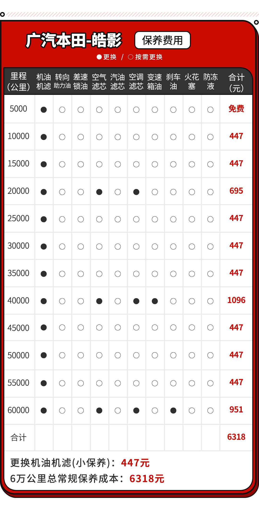 考虑到买1.5T的用户相对偏多,我们这次暂且按照1.5T车型来计算。从价格费用来看,一次常规保养只要447元还是非常亲民的,只是在4万公里的时候需要更换变速箱油,价格会去到1000出头。