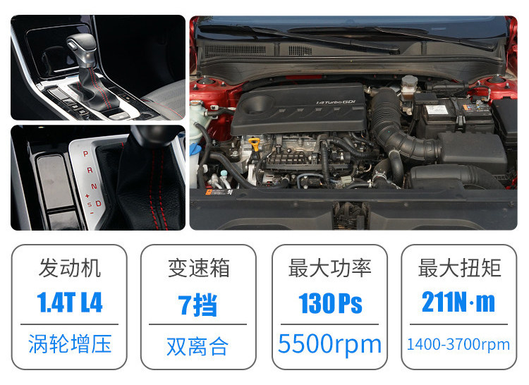 起亚K3采用的是1.4T涡轮增压发动机和7速双离合变速箱,最大马力130Ps,最大扭矩211N·m。可能有些小伙伴会说,这样的参数并不算特别亮眼,因为大众的1.4T都能做到150Ps了。不过在12万的价位上,这款1.4T的发动机无论是动力、油耗、平顺性,都是有竞争力的。