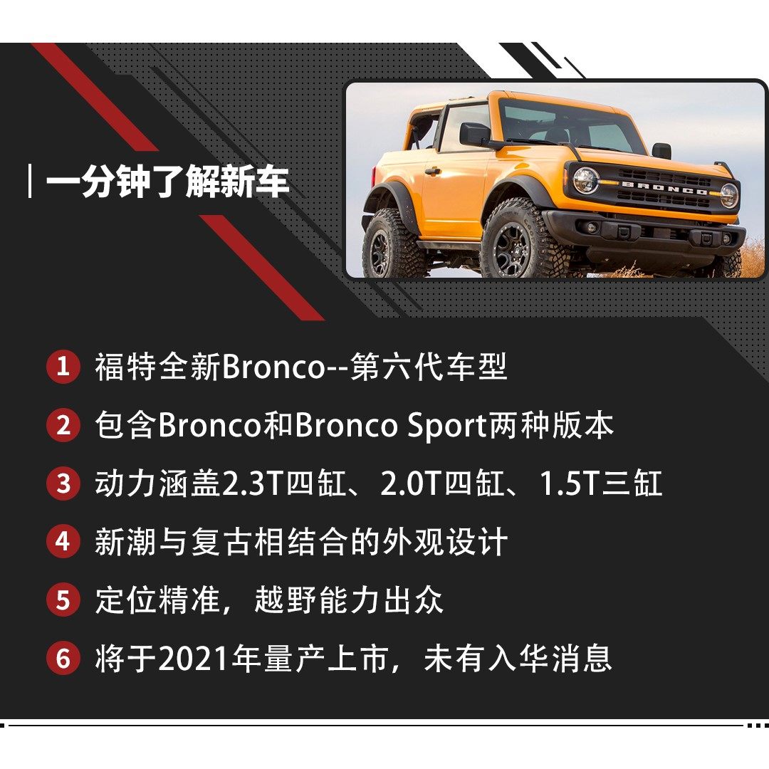 另一方面,定位于硬派外观的Bronco Sport则面向更细分的家用SUV市场,其起售价为3万美元(约人民币20.99万元)。教授相信,全新Bronco家族于2021春季在美国上市后,很快就会与锁定的竞品挑起新一轮斗争。