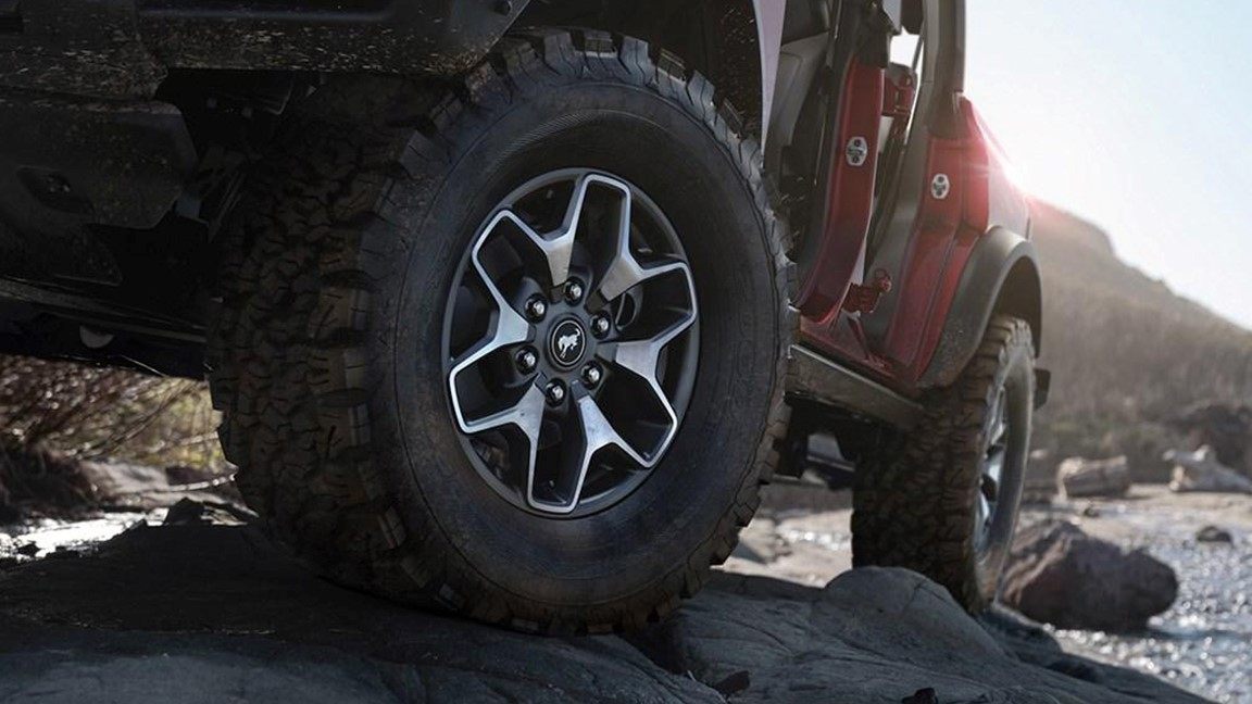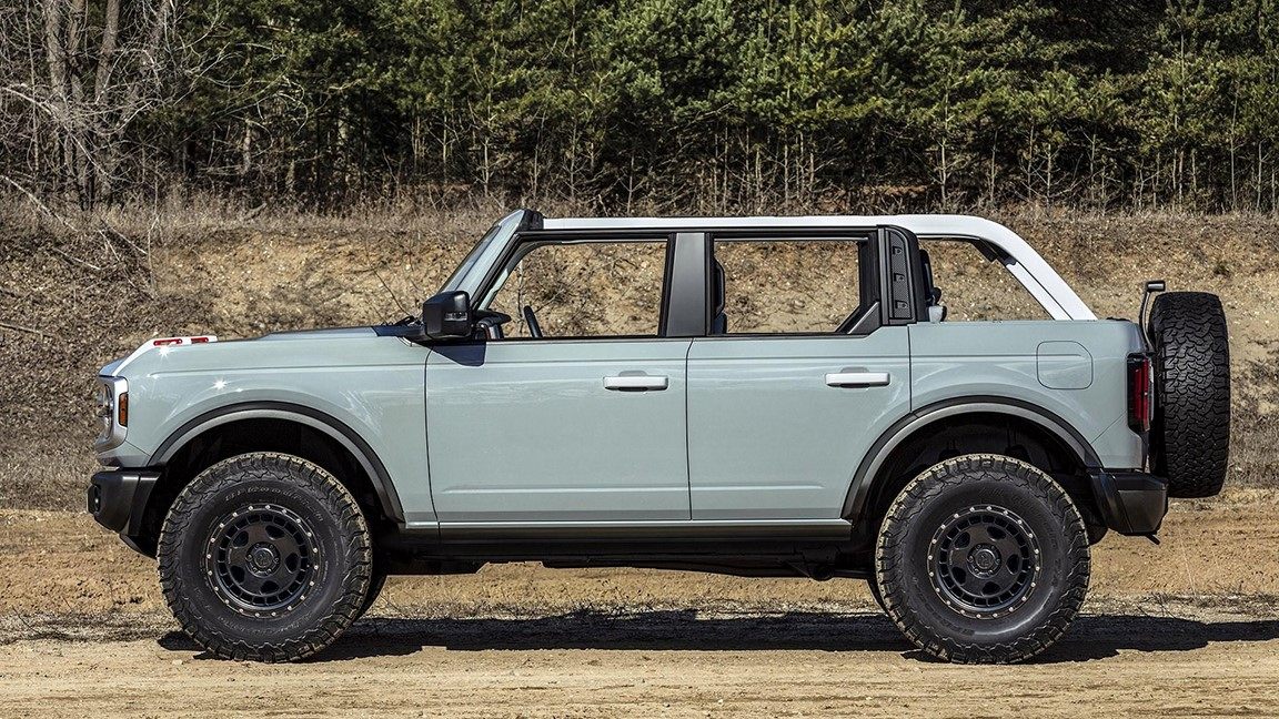 全新Bronco的双门和四门版车型在车侧设计上大体一致,其配有黑色外套轮眉、外挂备胎等, 并拥有294mm的离地间隙,850mm的涉水深度、接近角29度、离去角37.2度等等,无不彰显着强悍的越野能力。