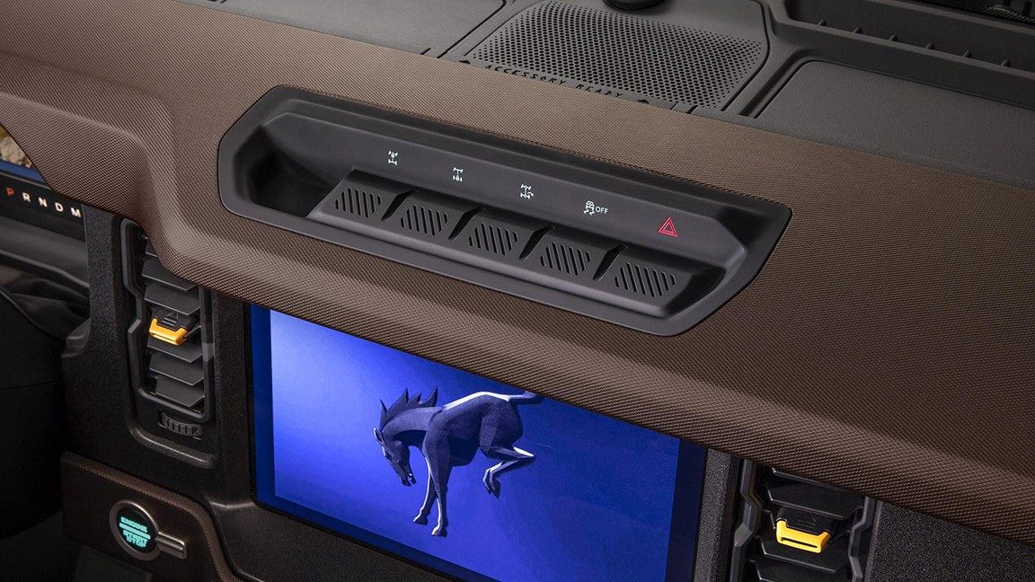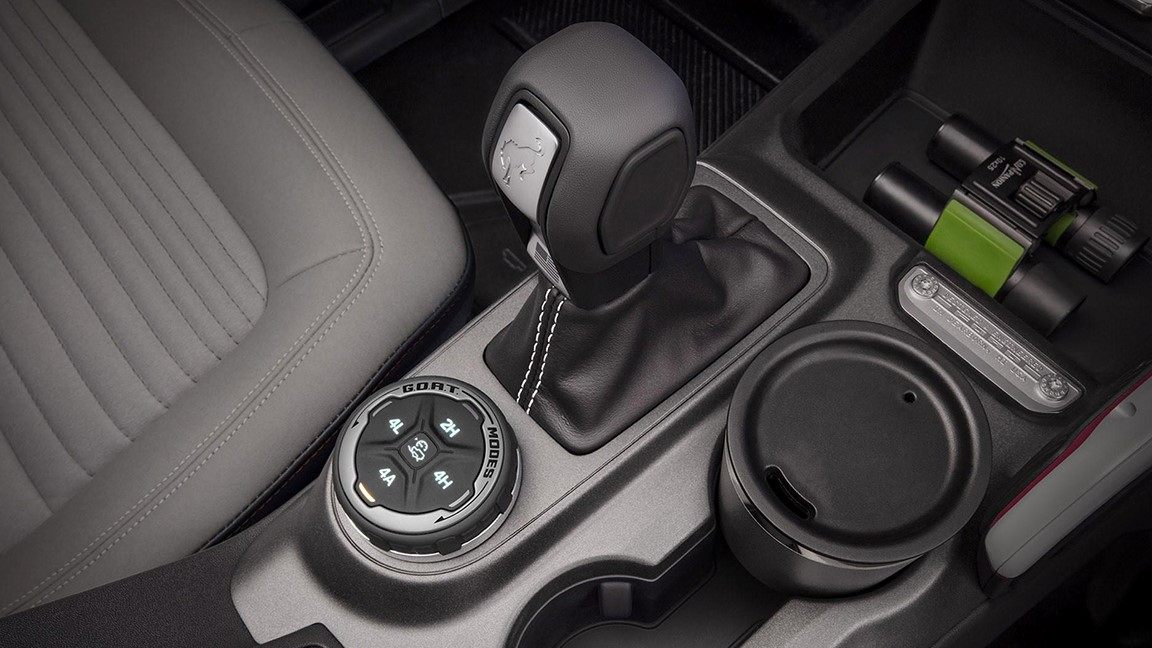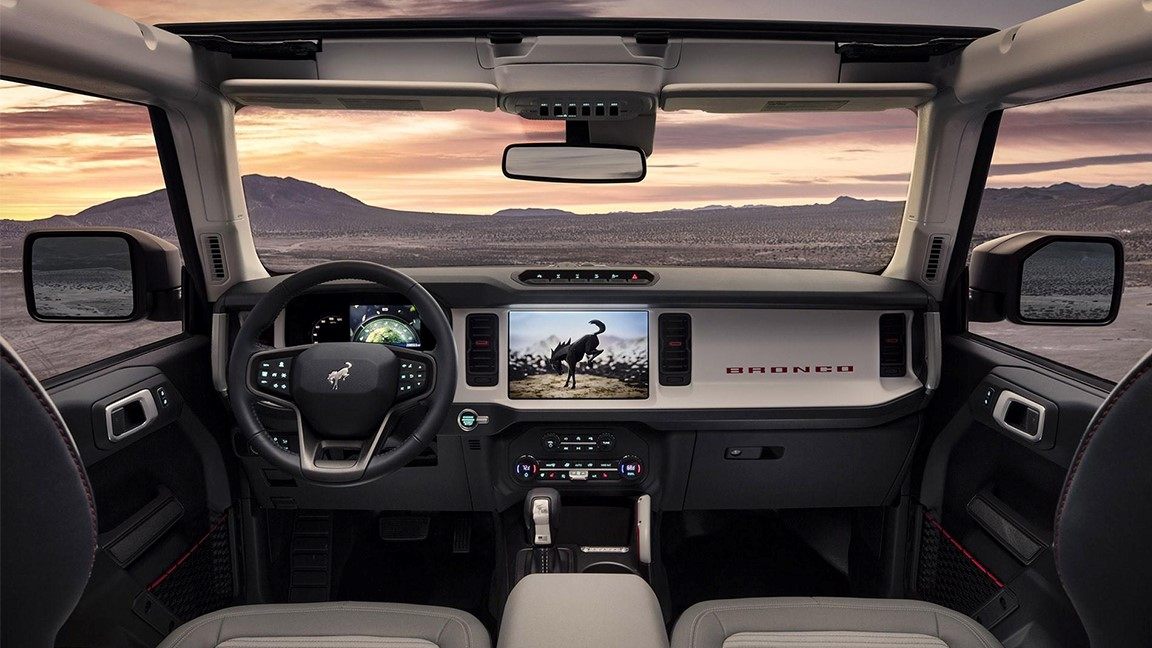 而四门版Bronco采用白灰色调的搭配后反而显得豪华一些,不过在设计造型上与两门版差异不大,其依然采用常规的空调面板、传统档把以及设有粗壮的把手。