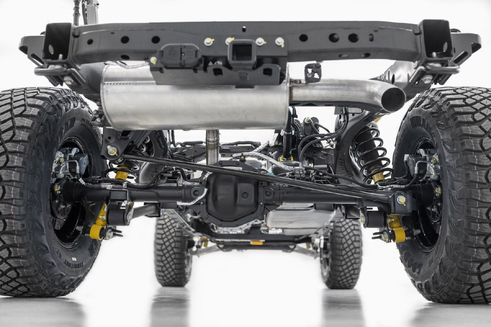 而在看不到的地方,据说福特Bronco的前后桥供应商与竞品牧马人出自同一家—Dana,新车采用了非承载式车身结构,前双叉臂后整体桥悬架架构,并可选Bilstein长行程避震器,耐久度和舒适性更强。