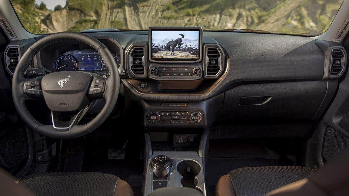 内饰部分也不意外,Bronco Sport更注重居家和实用,在设计上不会太过花里花俏,中控台造型也回归到福特最新的语言,同时换上了普通的三幅式方向盘以及旋钮式档把机构。