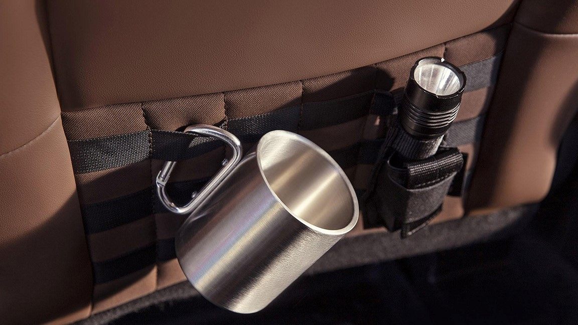 此外新车中网下方还配有越野专用的横条日行LED灯,以应对路况不明的道路,同时引擎盖两侧还配备了可扎绑式的防滑钉,为的就是固定车顶行李/行李架。