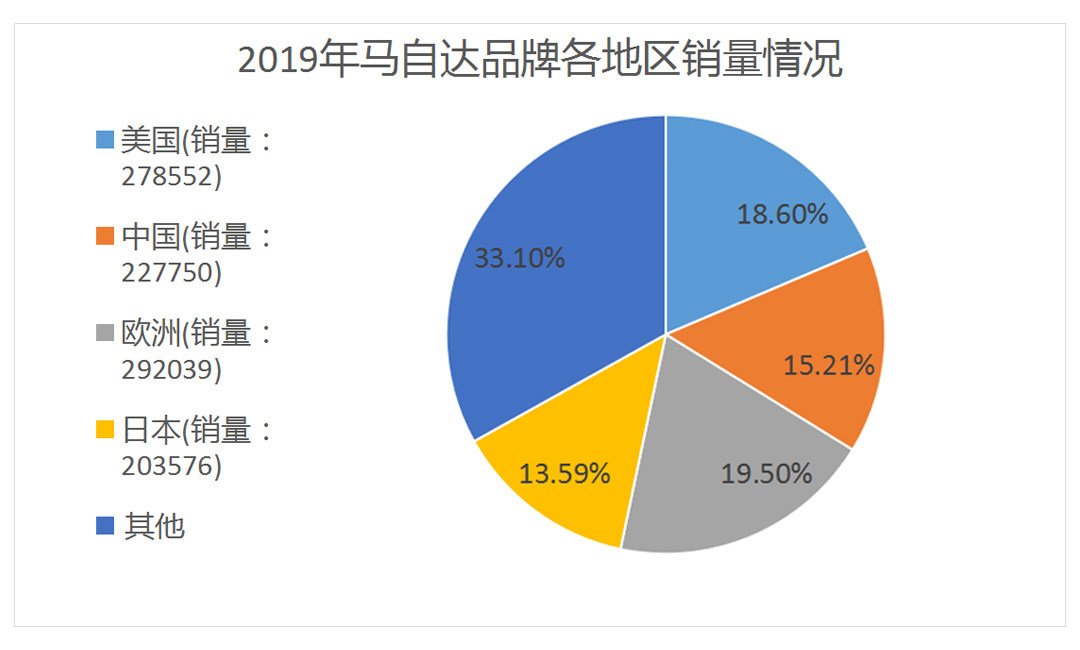 那么我们再来看看马自达2019年的销量情况,马自达去年的全球销量为149.78万辆,其中中国市场仅22.78万辆,对比美国(27.86万辆)和欧洲市场(29.20万辆)销量占比并不大,中国市场的马自达产品销量仅占全球销量的15.21%。中国消费者一年买下来的丰田车就比马自达全球一年卖出的辆都多。