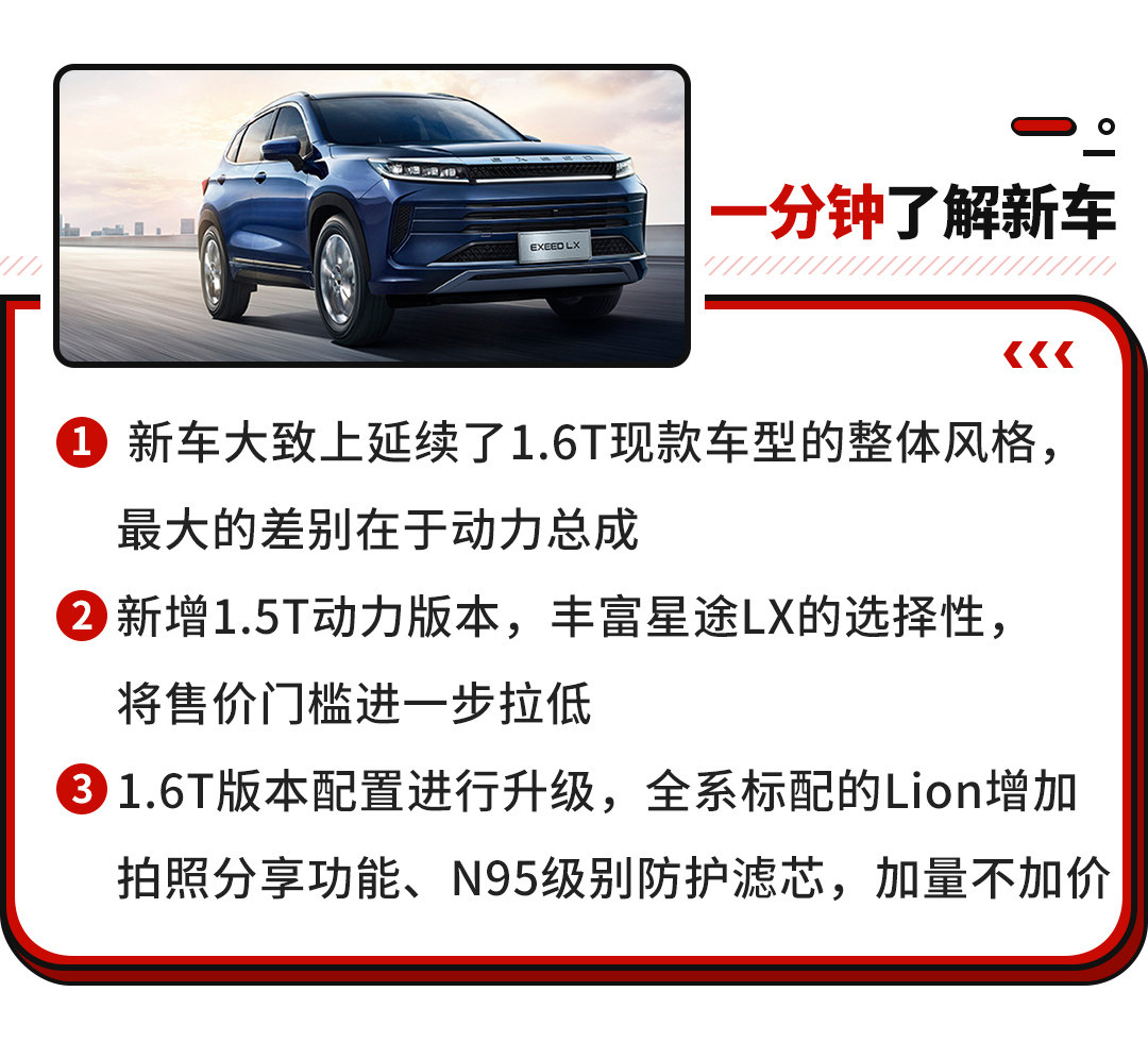 星途LX在原有的1.6T动力版本上,新增1.5T动力版本,售价降低能够适配更多的消费群体。该1.5T新增动力版本,虽然动力输出有所降低,但其他方面并没有降低,尤其是智能与舒适性方面配置。两款不同动力版本车型也有了更好的区分,1..5T更多的是从性价比出发,而1.6T动力车型更多的是将动力以及科技化等方面作为优势。