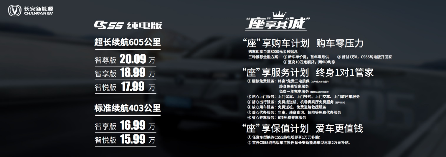 伴随着CS55纯电版上市,长安新能源还推出“座”享其“诚”计划,拿出更大诚意,让用户更轻松地拥有纯电新生活的无限乐趣。“座”享购车诚意,提供三种金融购车方案,畅快购车零压力;“座”享服务诚意,提供多项硬核免费服务,终身管家1对1服务,电车生活更惬意;“座”享保值诚意,当前爱车置换CS55纯电版享1万补贴,首任CS55纯电版车主换任意长安新能源汽车享2万置换补贴。