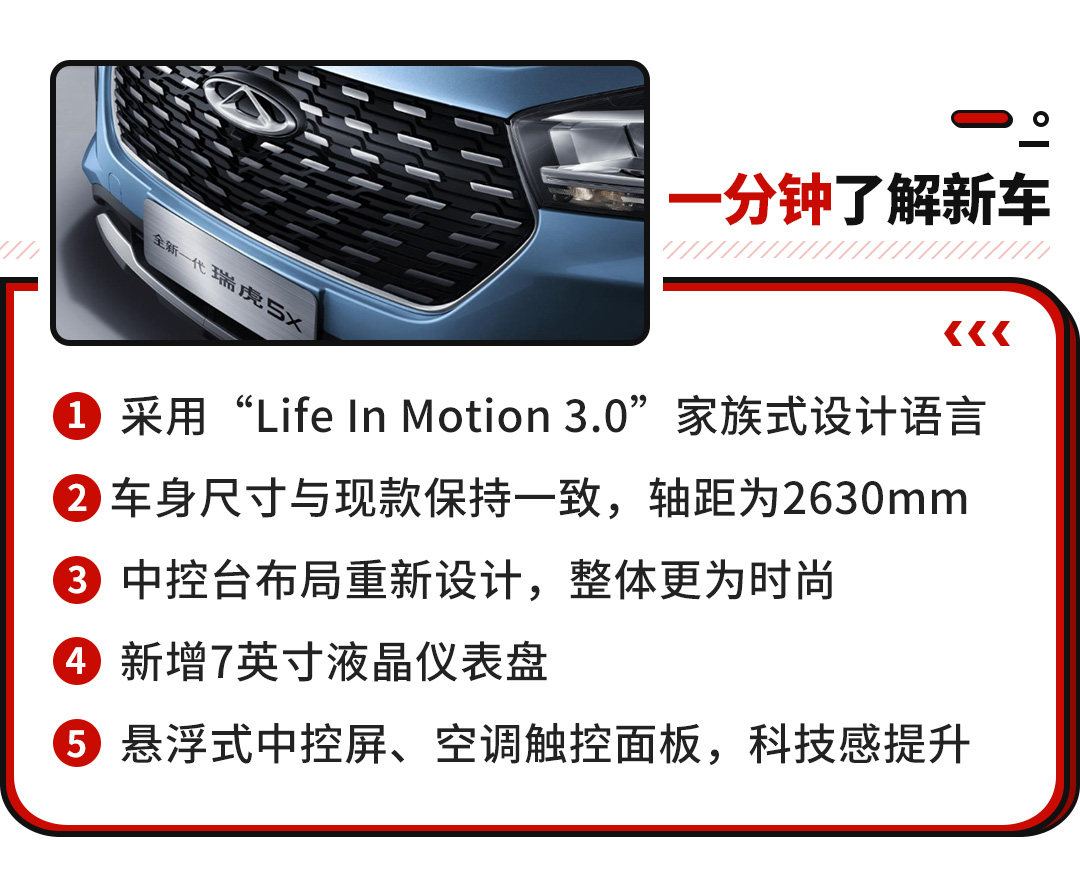 今天我们聊下很亲民的SUV车型--瑞虎5X,新款上市6.99万起,比老款贵了一万元,主要原因是新增了倒车影像、无钥匙启动以及中控大屏等功能,还是有一定价值的。那么这款车实力如何?我们接着往下看。
