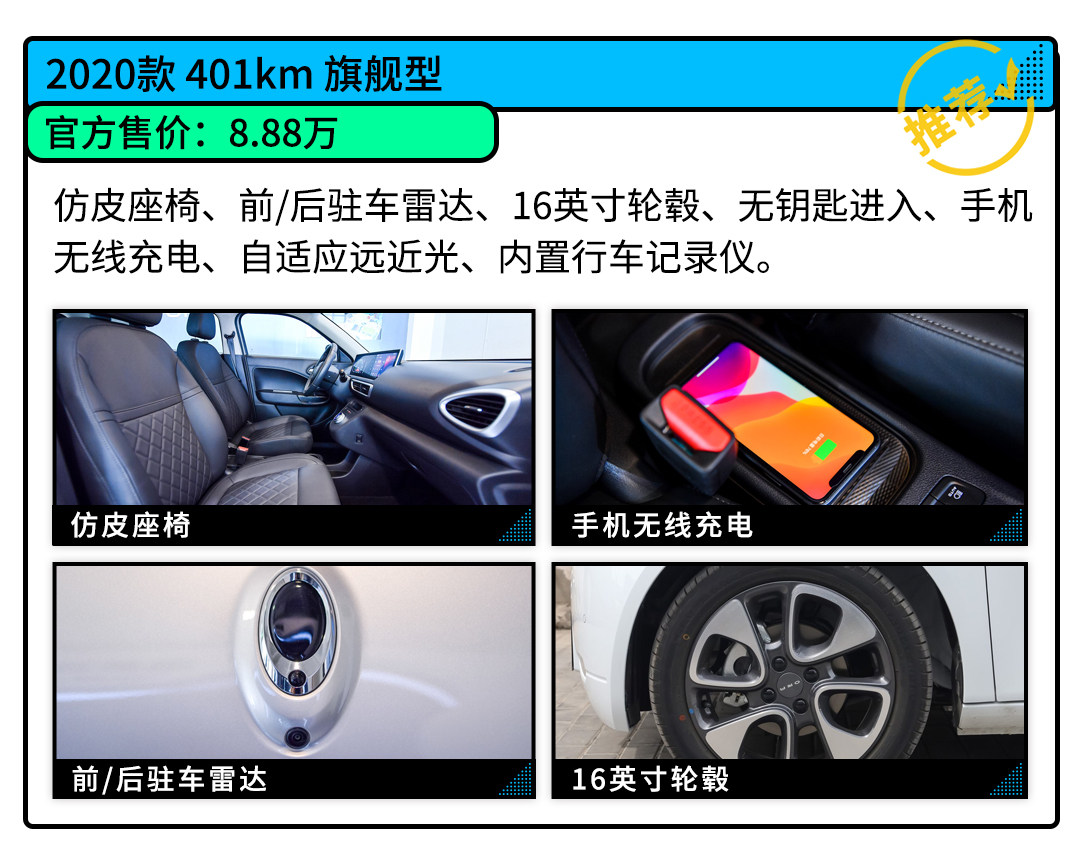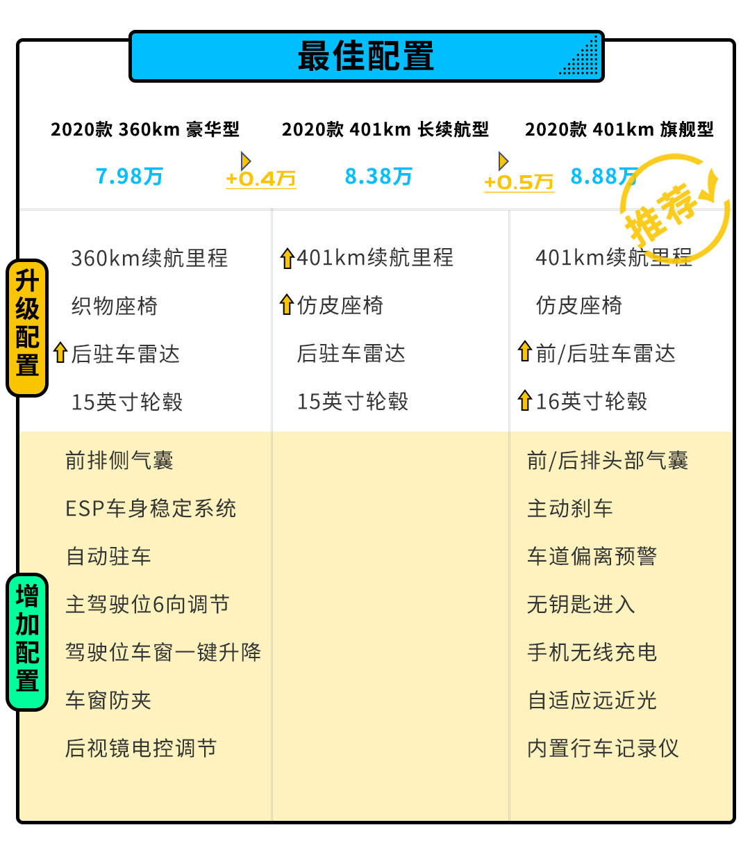 就功能性方面来说,旗舰型对比长续航型仅高了5000元,但是有了头部气囊、主动刹车、车道偏离预警等更高的安全保护,而且手机无线充电,内置行车记录仪这些时下比较流行的配置竟也涵盖其中。从性价比的方面考虑这5000元绝对物超所值。而如果预算真的没那么丰富,其实401km 长续航型和360km 豪华型也值得考虑,两车虽然差价4000元,但升级主要还是集中在续航方面,因此在配置基本相同的两个版本中360km 豪华型会更值得预算不是很充裕的消费者考虑。