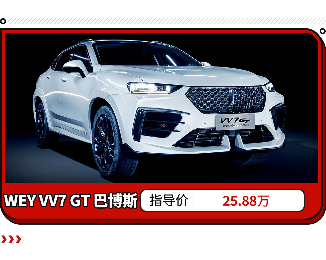 WEY VV7 GT巴博斯版,在外观上运用巴博斯专门设计的套件,不要以为普通巴博斯购买个包围就可以“假装”是巴博斯版,该车的翼子板以及前杠都是连成一体的,单独更换包围,会相当突兀。这也是厂家定制的优势,能够充分利用车辆的每一处设计。内饰部分,本来VV7就具有相当高的配置,所以更多的是在氛围上升级;如果在动力上能够进一步升级,那就更加贴合“官方升级”的定位,对于消费者来说也更有吸引力。