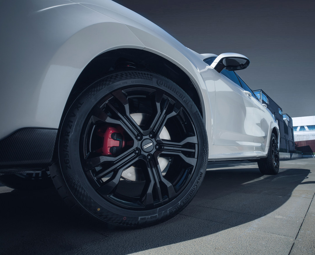 侧面依然延续了VV7 GT普通版的整体设计,说到变化,最明显的莫过于轮圈,五辐式的轮毂简洁之余不失运动感,熏黑的造型和纯白的车身形成对比;里面红色的卡钳相当醒目,虽然不是什么高性能产品,只是普通的双活塞,但在视觉效果的营造上却相当不错。轮毂尺寸是21英寸的,比普通车型大1英寸,既能保持原有的稳定性、舒适性同时,保证有不错的视觉感受。