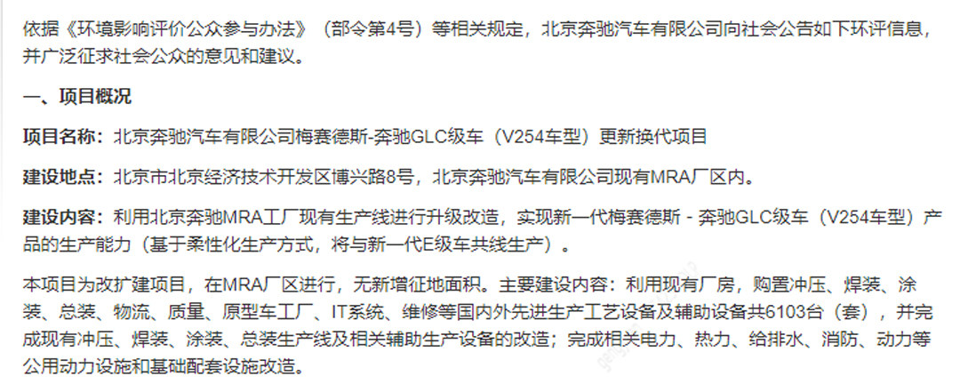 教授从网络上获悉,北京奔驰针对现款GLC的更新换代项目启动环评公示,未来代号为V254的新一代GLC长轴版基于奔驰最新MRA后驱模块化平台打造,将在北京奔驰MRA工厂与新一代E级共线生产。从此前外媒曝光的谍照来看,新一代GLC已经开始在海外进行路试,新车的C柱和D柱之间距离比现款车型更大,所以推测新一代车型会针对第二排空间进行优化,同时不排除会推出7座版本。动力方面,就海外版车型来看,新一代GLC将与C级共享动力总成,提供多款四缸发动机+48V轻混系统可选,PHEV车型也会跟随GLC换代而推出。